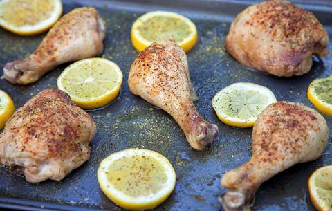 Spread chicken evenly on cooking sheet & add sliced lemons the last 10 minutes of cook time. -