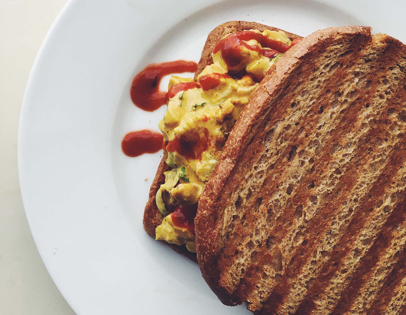 Toast your pumpkin bread and add a scoop of the curried cauliflower mock-chicken salad. -